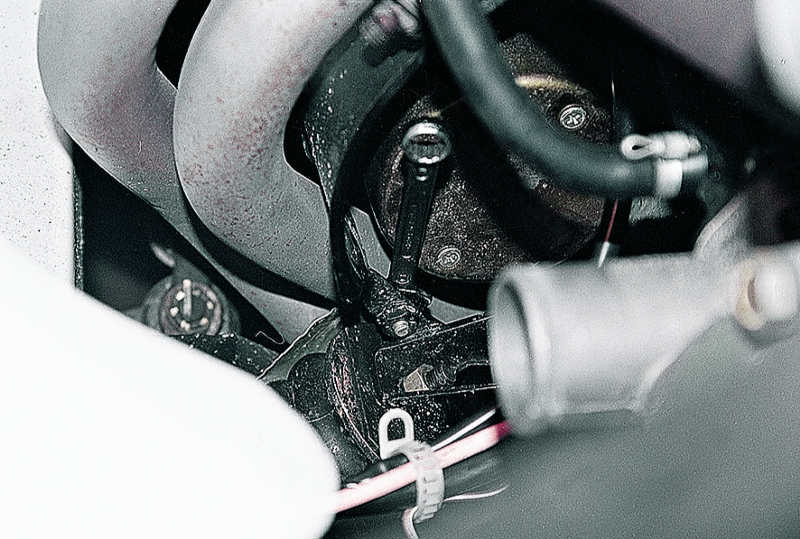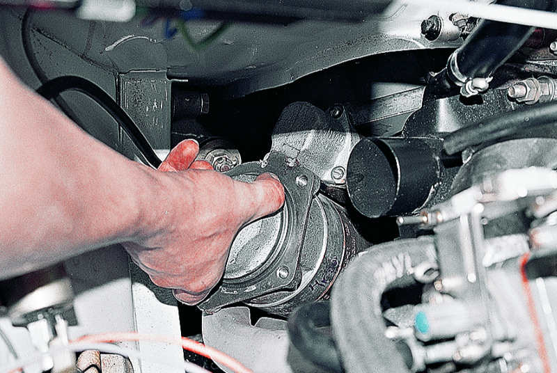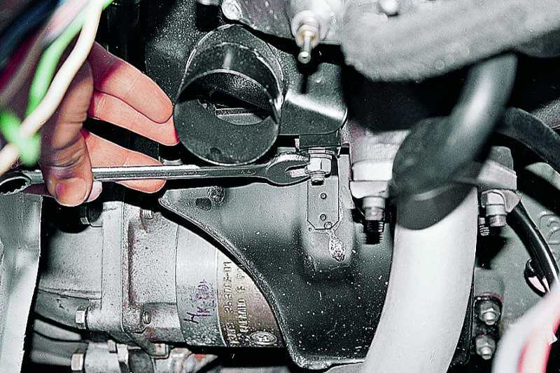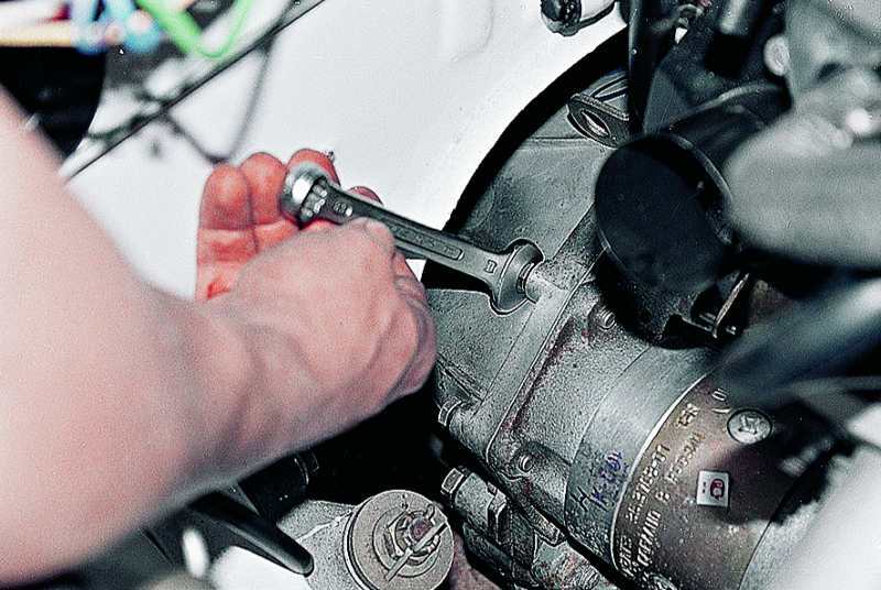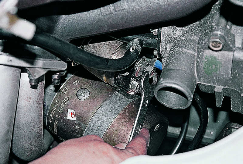 - Отворачиваем два верхних крепежных болта, с помощью которых стартер соединяется с картером.