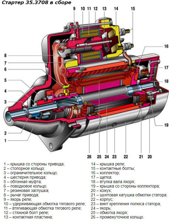 На шестерках, вышедших с конвейера после 80х, поставлены стартеры с торцевым коллектором 35.3708. Более старые модели были оснащены моделью СТ-221. Конструктивные особенности этих устройств практически не отличаются, поэтому при замене можно ставить любой. Разница заключается в том, что в более современных стартерах стоит одна шунтовая катушка и три сериесные, а в старых моделях – по две катушки обоих типов.
