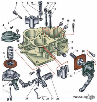 - возьмите инструкцию от вашей модели карбюратора. Разобрать и собрать его может быть не проще, чем масштабную модель, поэтому делайте все постепенно (см. рис.)